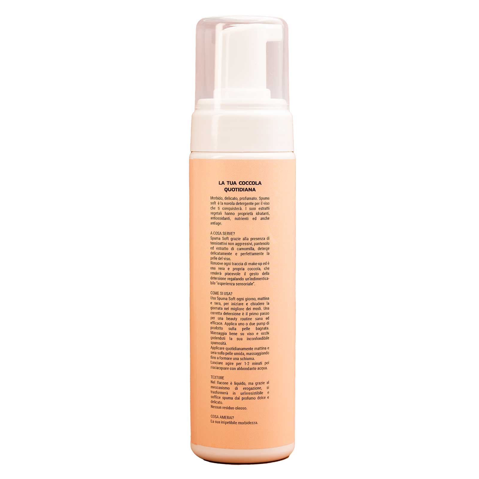 Ti innamorerai della texture morbida, delicata e profumatissima di Spuma Soft – una mousse soffice come una nuvola, ideale per detergere in un solo gesto la pelle del viso.